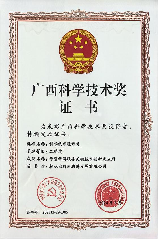 近日,自治區(qū)黨委、政府在南寧召開全區(qū)科技大會、廣西科學技術獎勵大會,揭曉了2023年度廣西科學技術獎獲獎成果名單。其中,桂林投資集團桂林出行網旅游發(fā)展有限公司科技成果“智慧旅游服務關鍵技術創(chuàng)新及應用”榮獲2023年度廣西科技進步二等獎。